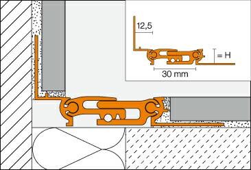 The anchoring legs can also be integrated into the mortar bed for other covering materials, such as carpeting or VCT. Therefore, the profile can move together with the respective covering assembly. The 1-3/16" (30 mm) wide telescopic center section absorbs movements of 7/32" (5 mm). The lateral pivot joints allow for the absorption of three-dimensional movement.