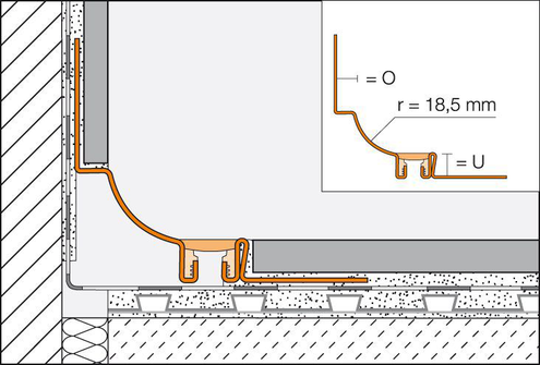 The profile's 23/32" (18.5 mm) radius prevents the accumulation of dirt and makes cleaning simple. The profile separates the tile fields that meet at inside corners where limited movement is expected.