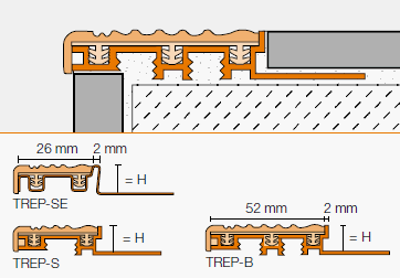 TREP-B Aluminum support with thermoplastic rubber insert L = Profile Length H - Tile thickness 8 mm - 5/16" 10 mm - 3/8" 12.5 mm - 1/2" 15 mm - 9/16" 25 mm - 1" 2.5 m - 8' 2-1/2" color*