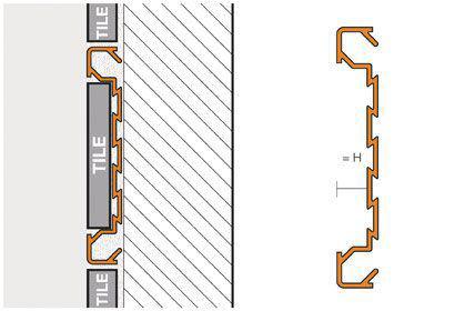 The profile is available in anodized aluminum and features a 2" (51 mm) -wide recessed section with dovetailed grooves to which field or accent tile up to 5/16" (8 mm) -thick is bonded. The top and bottom edges of the profile are square and designed to integrate with the QUADEC profile.
