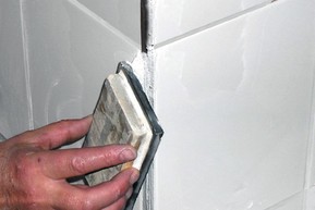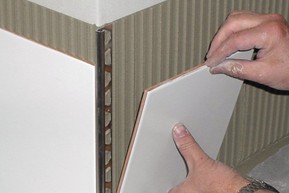 2. Using a notched trowel, apply thin-set mortar to the area where profile is to be placed. If Schluter-RONDEC is to be used as edging for an outside wall corner, finish tiling one wall first; then trowel thin-set mortar over the corner area of the second wall.