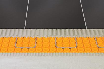 Schluter-DITRA-HEAT is a polypropylene membrane with a cut-back stud structure and an anchoring fleece laminated to the underside. The thickness of the mat, including the stud structure is 1/4" (5.5 mm). The stud structure of DITRA-HEAT is specifically designed to secure DITRA-HEAT-E-HK electric floor heating cable in place. In addition, DITRA-HEAT integrates cus- tomizable, comfortable electric floor warming with the functions associated with DITRA: uncoupling, waterproofing, vapor management and support to ensure a long lasting installation.